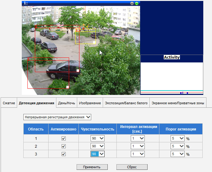 Не забудем и о детекторе движения — это не менее важный вопрос. Данная настройка производится в отдельной одноименной вкладке общего параметра Видео. Всего доступно три прямоугольных зоны, в которых будет отслеживаться изменение картинки. Эти зоны могут иметь любой размер, перекрывать друг друга, обладать независимыми настройками чувствительности, интервала и порога срабатывания. По умолчанию чувствительность составляет 70, однако, по нашим наблюдениям, такой величины недостаточно для уверенного срабатывания детектора движения. Поэтому чувствительность во всех трех зонах была поднята до 90.