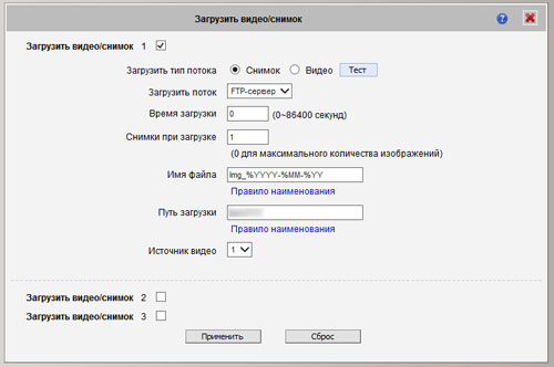Следующий шаг — выбор способа реакции камеры на то или иное событие. Имеется три варианта: послать оповещение (используется электронная почта и HTTP CGI), загрузить снимок или видео (используется электронная почта, FTP и HTTP CGI) или послать URL-команду (HTTP CGI). Выберем второй пункт, заставим камеру по тревоге отсылать снимок на FTP-сервер, параметры которого мы заполнили ранее: