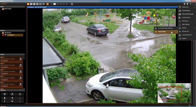 Главное окно программы разбито на несколько модулей, количество и расположение которых настраивается по желанию. Окно просмотра живого видео может отображать картинку со ста камер одновременно, здесь же можно активировать режим «патруль» , когда на экран попеременно выводится картинка с разных камер. Изображение легко масштабируется простым поворотом колесика мышки, при этом в правом нижнем углу появляется миниатюра, где красной рамкой очерчен видимый в данный момент регион. Увеличить конкретный участок изображения можно, просто обведя его мышкой.