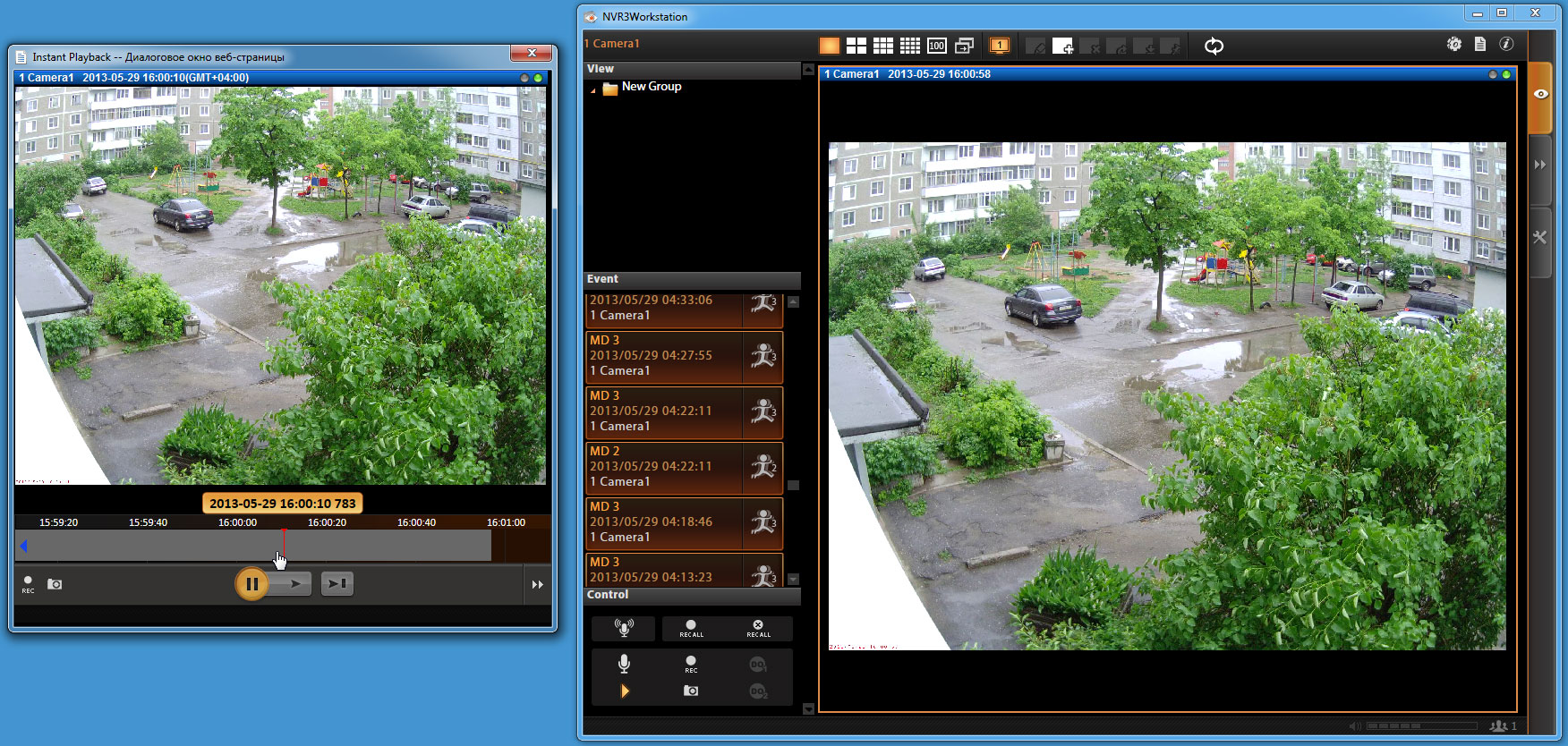 В левой части окна расположен список последних событий, накапливающийся с момента запуска программы. Этот список состоит из указателя типа события, даты и имени камеры, зафиксировавшей данный event. Здесь же отображается уровень зафиксированного камерой движения (от 1 до 3). Перейти к быстрому просмотру последних событий можно двойным щелчком мышки на выбранной строчке. В появившемся окне просмотра, которое называется Instant Playback (мгновенное воспроизведение), пользователь может быстро «отмотать» видеозапись назад или вперед, это делается путем перетаскивания серого участка таймлинии относительно центрального указателя. При перетаскивании программа отображает выбранное текущее время с точностью до секунды.