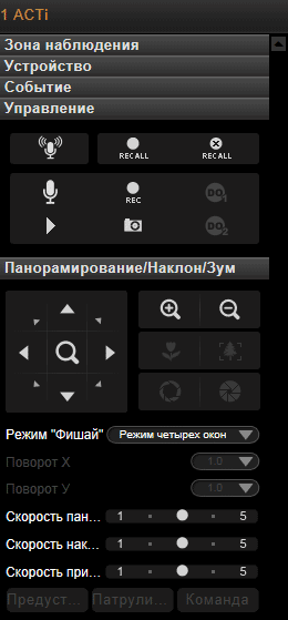 Во всех режимах, в которых предусмотрен PTZ-контроль, управление виртуальными камерами возможно как с мышки, так и с панели в левой части экрана: