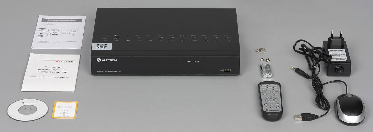 В комплекте с видеорегистратором в нашем случае шли: внешний блок питания 12 В 2 А, краткая инструкция по настройке и использованию на русском языке, листовка на английском языке с описанием работы с мобильным приложением, миникомпактдиск, компьютерная мышка с интерфейсом USB, ИК-пульт дистанционного управления с батарейками (2×AAA), комплект винтов, сетевой патч-корд, один аналоговый видеокабель.