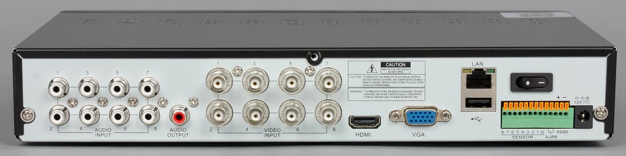 Все остальные разъемы практически полностью занимают заднюю панель. Здесь установлены: восемь аналоговых входов и один выход для звука, восемь BNC для аналоговых и AHD-видеокамер, видеовыходы HDMI и VGA для монитора, гигабитный сетевой порт с индикаторами, второй порт USB, вход блока питания и выключатель, колодка цифровых входов-выходов (восемь тревожных входов, один выход, шина RS-485). Опирается видеорегистратор на четыре мягкие ножки.