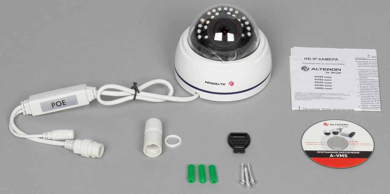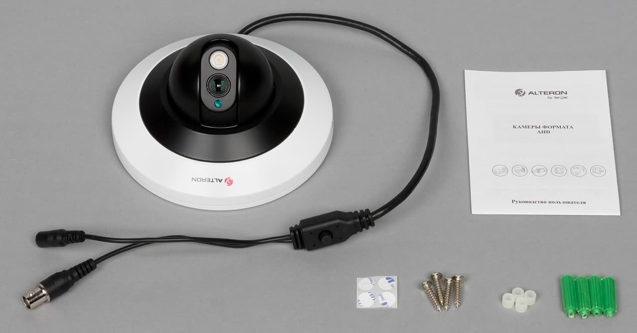 Данное устройство относится к сегменту купольных AHD-камер, предназначенных для использования внутри помещений. В комплект поставки этой камеры входит инструкция и монтажный набор.