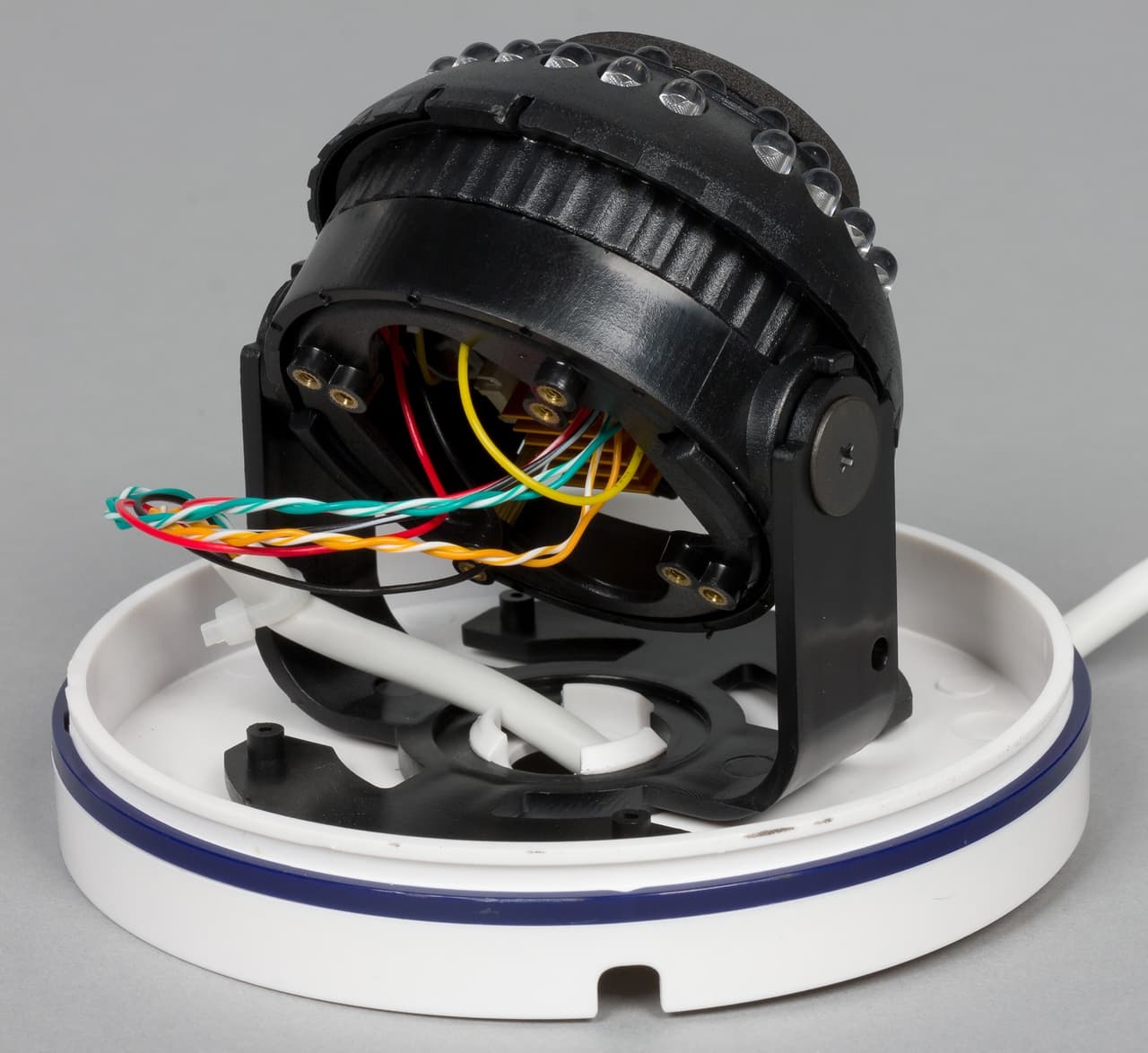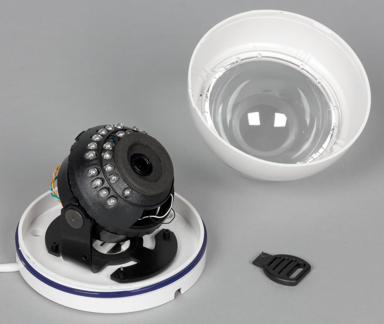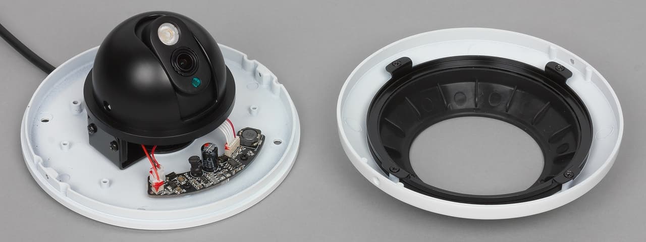 Для крепления базы нужно сначала снять верхнюю часть корпуса с куполом, которая держится на защелках. Эта же операция потребуется и для регулировки наклона объектива камеры.