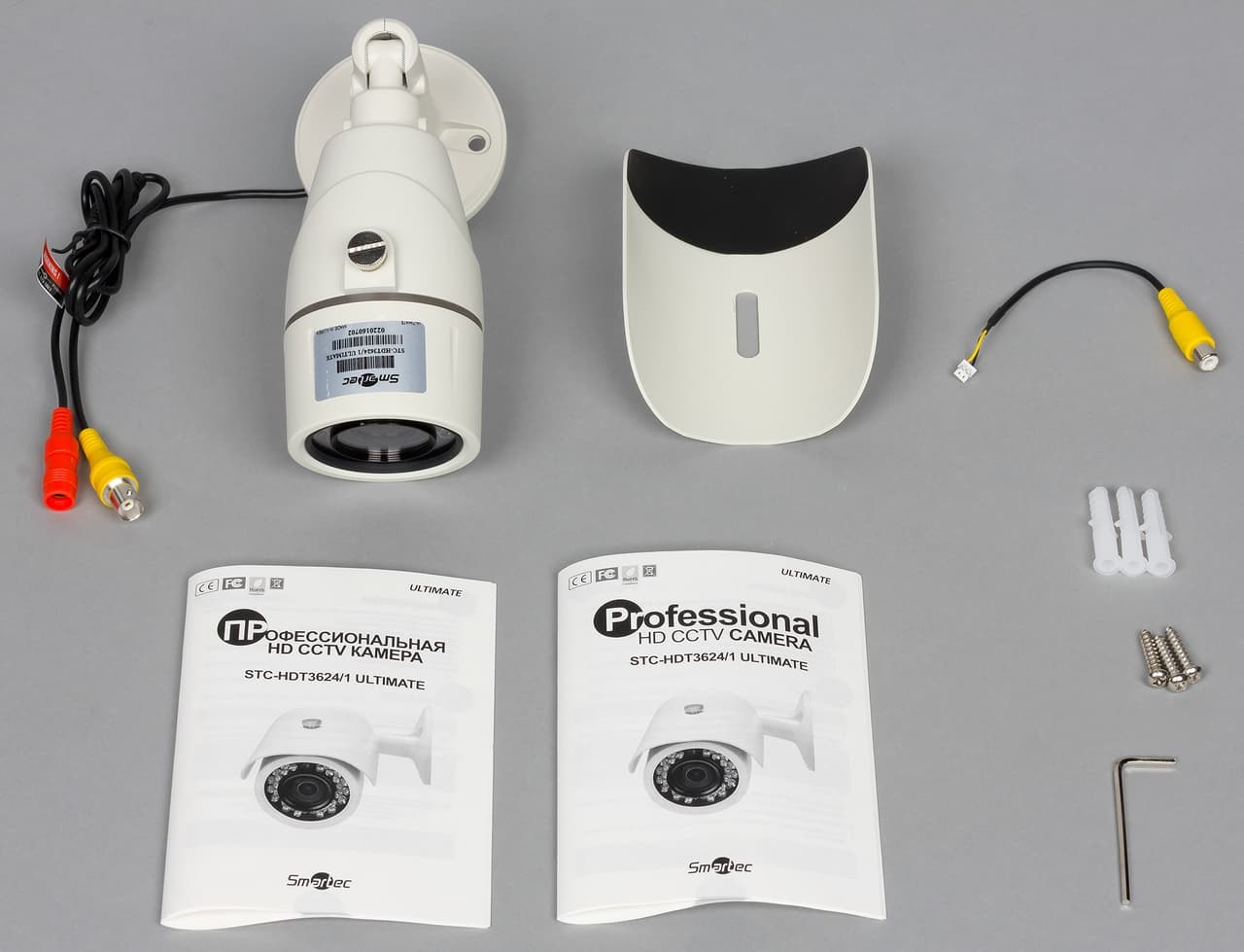 Третья камера, которую мы использовали для теста видеорегистратора, относится к классу уличных всепогодных аналоговых моделей высокого разрешения. В комплект поставки камеры входит защитный козырек, набор анкеров и шурупов для крепления, шестигранные ключи, инструкции на русском и английском языках.