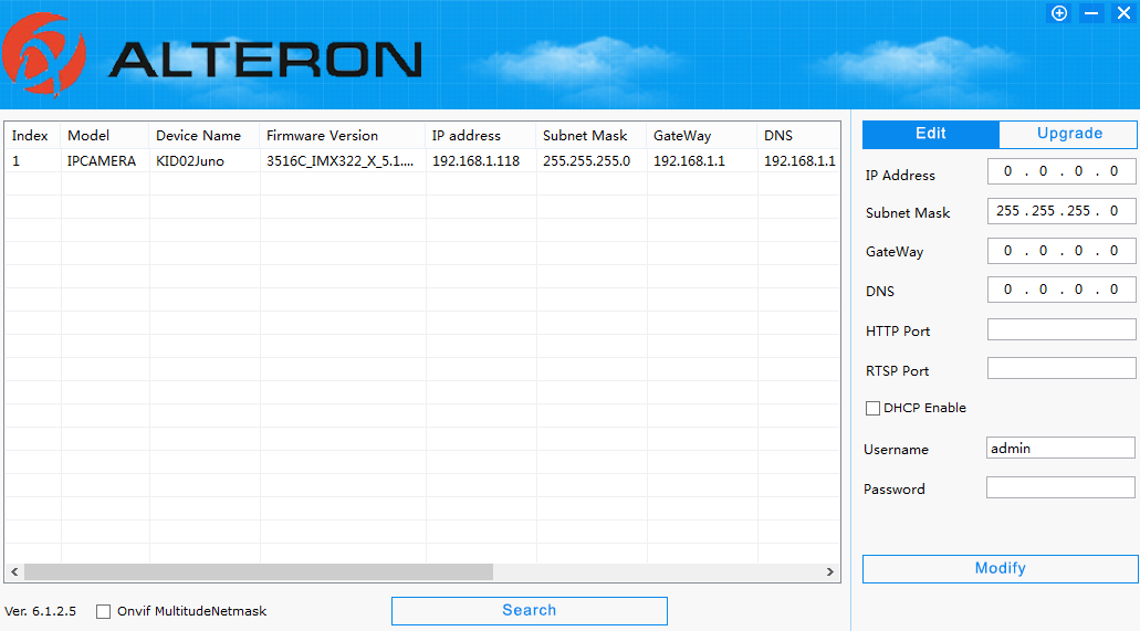 По умолчанию камера настроена на фиксированный IP-адрес. Найти устройство в сети и изменить сетевые параметры можно через комплектную утилиту IPSearcher, доступную для операционных систем Windows.