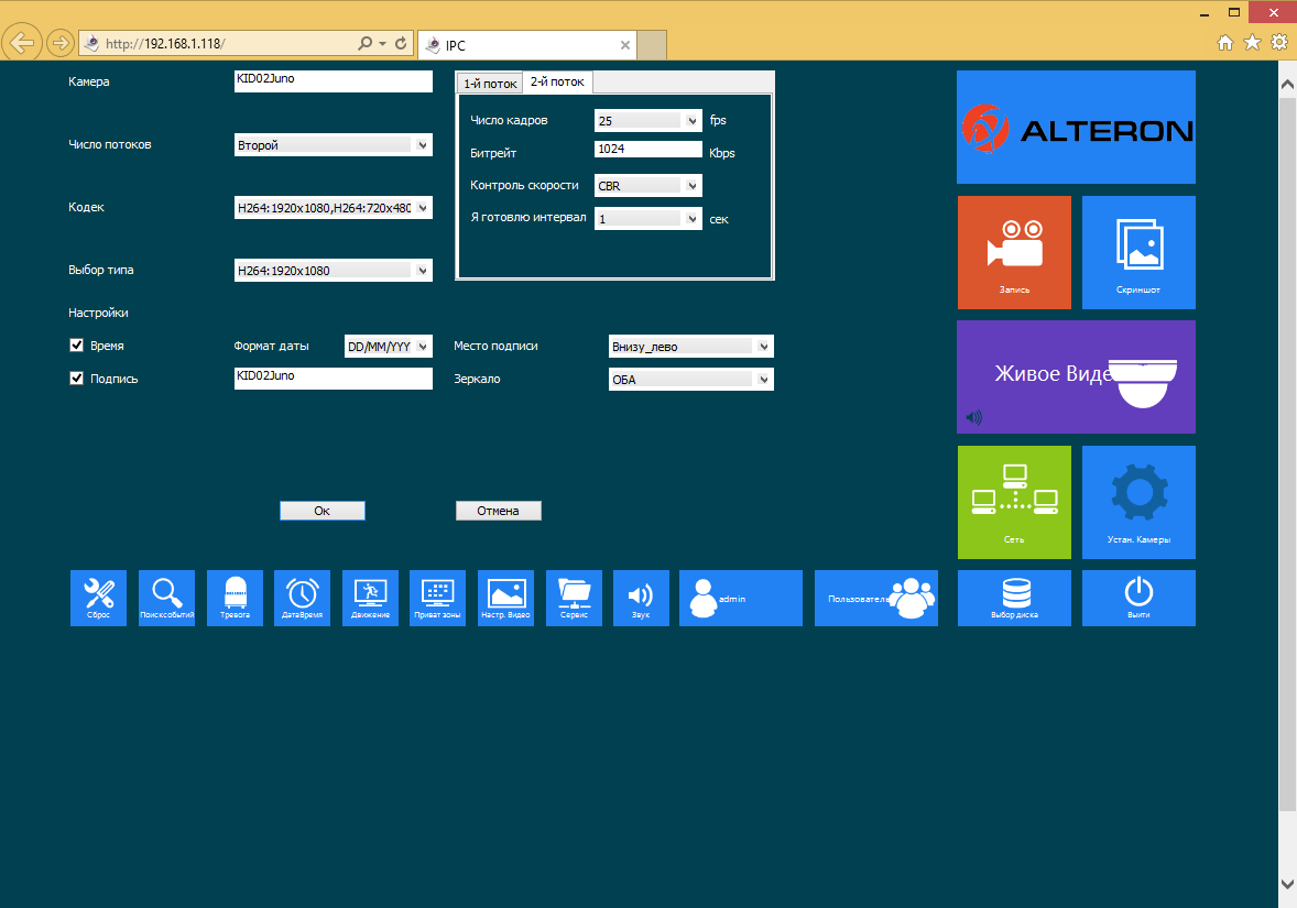 Также есть возможность выбора параметров для видеопотоков с камер, что позволяет использовать для архива одно качество видео, а для живой трансляции — другое.