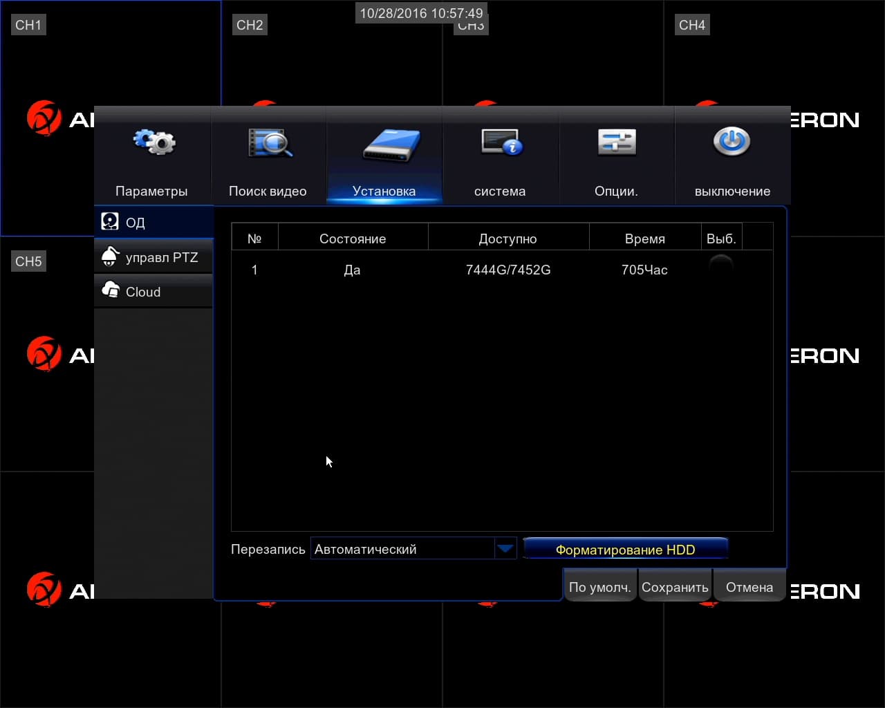 В группе «Установка» находятся пункты форматирования жесткого диска, настройки каналов PTZ для камер и записи информации с камер в облачное хранилище DropBox.