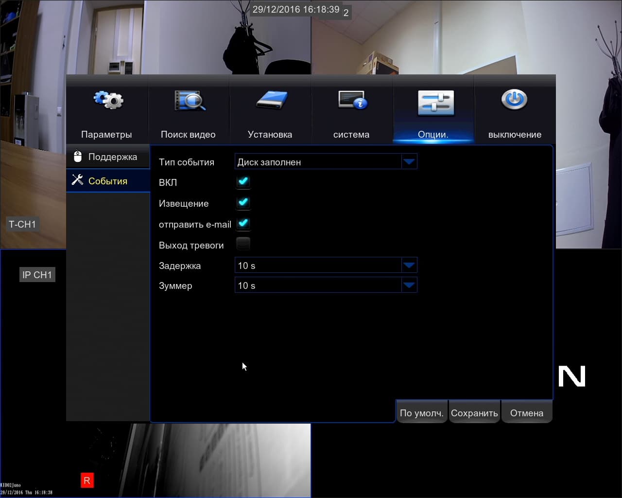 Для таких системных событий, как переполнение или ошибка диска, а также потеря сигнала (работает и с аналоговыми камерами и с IP-камерами) можно выбрать варианты сигнализации и их длительность.