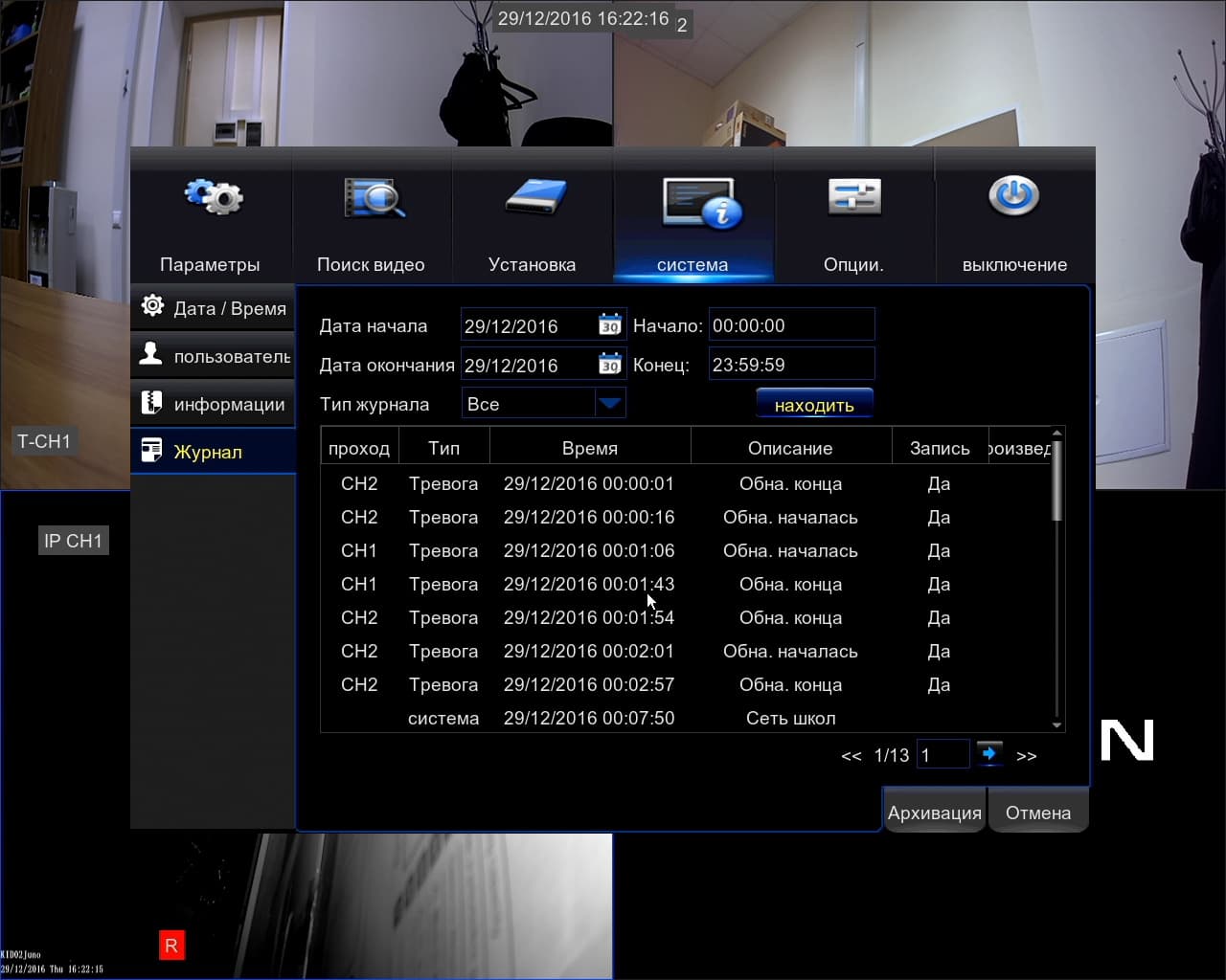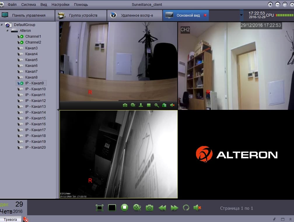 В режиме просмотра живой картинки на экран можно настроить схему вывода изображений под любое число камер. При работе с архивными записями есть поиск по дате и времени, по событиям, по системному журналу.