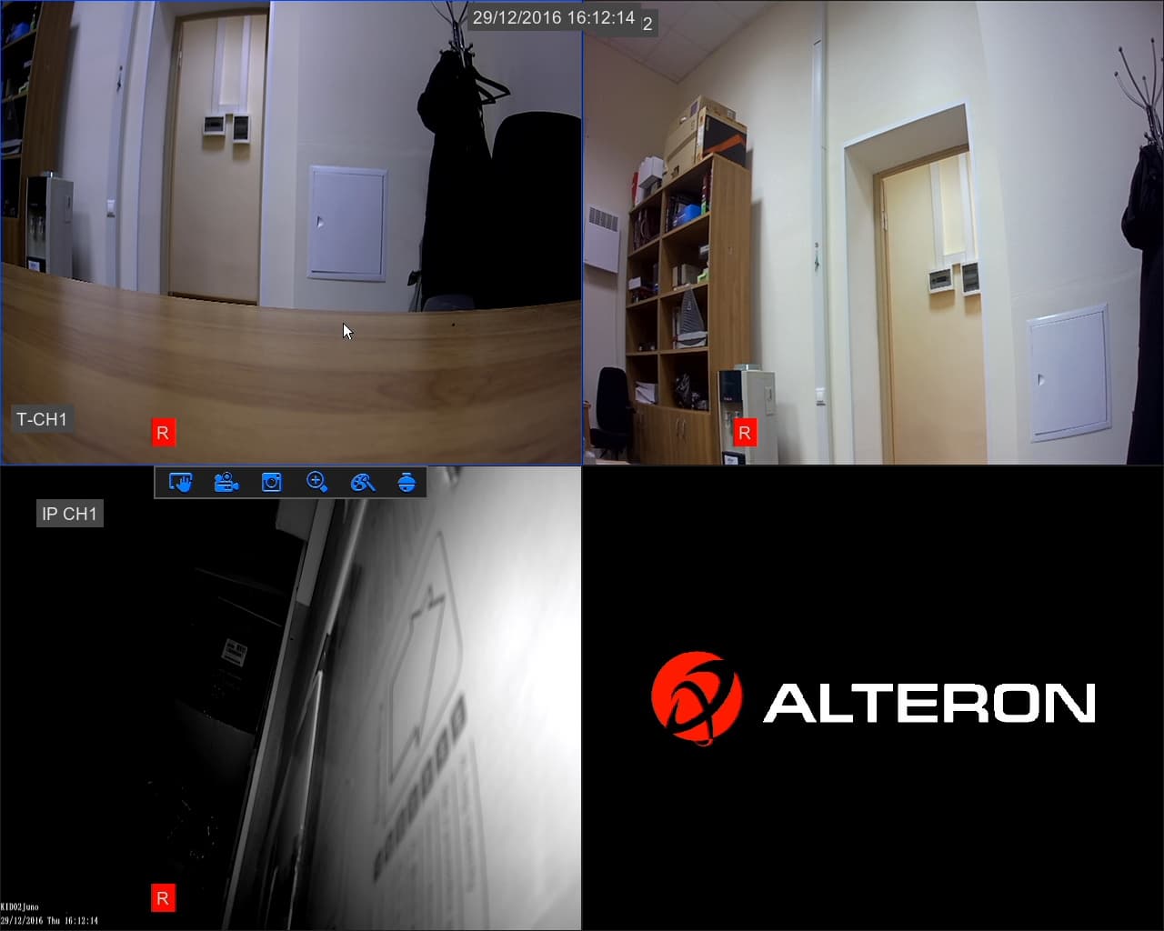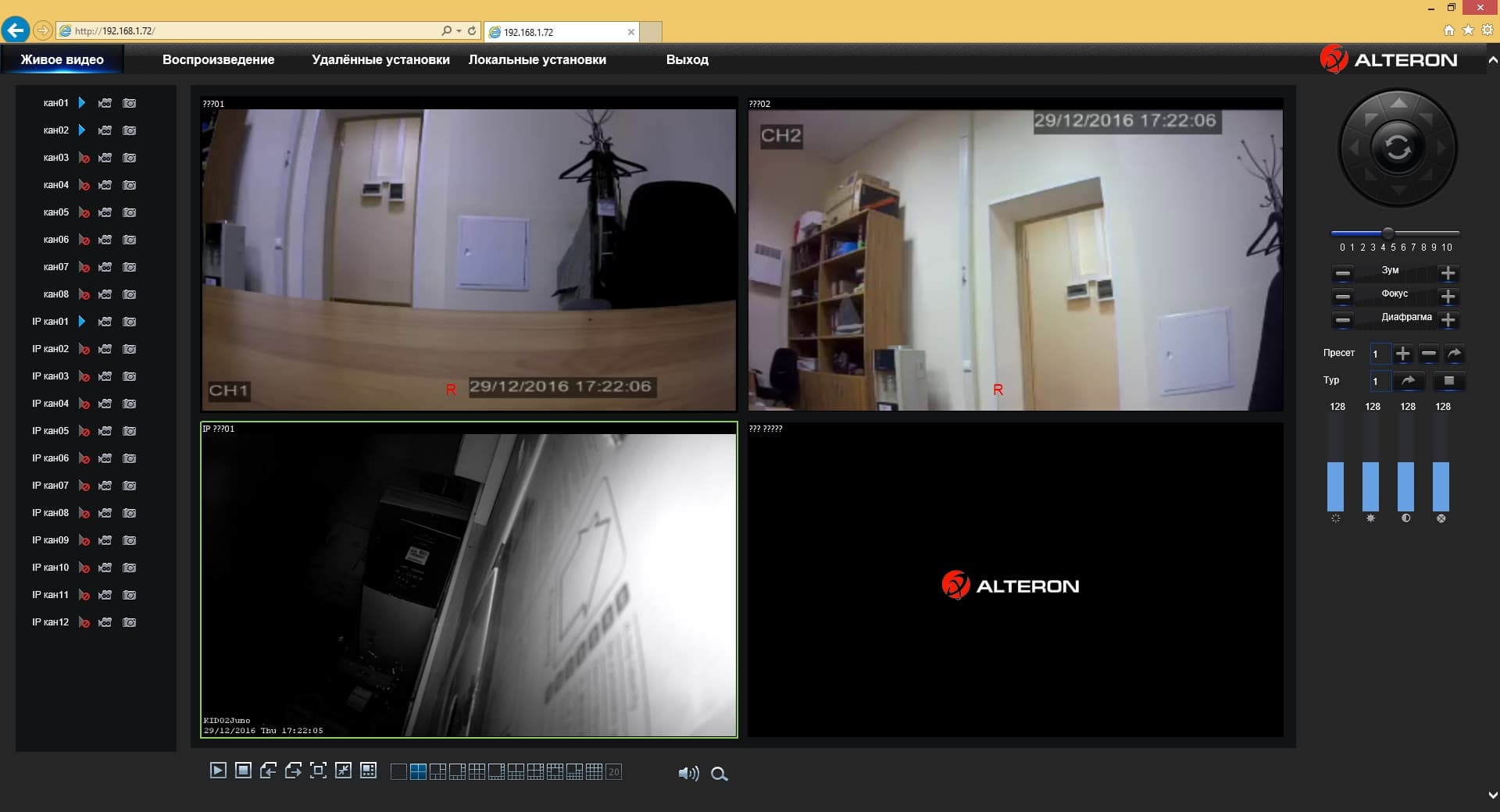 После этого вы обращаетесь к веб-интерфейсу видеорегистратора и видите на первой странице живую картинку с камер. Здесь также можно менять и настраивать сетку, выбирать камеры, подстраивать картинку, использовать PTZ.