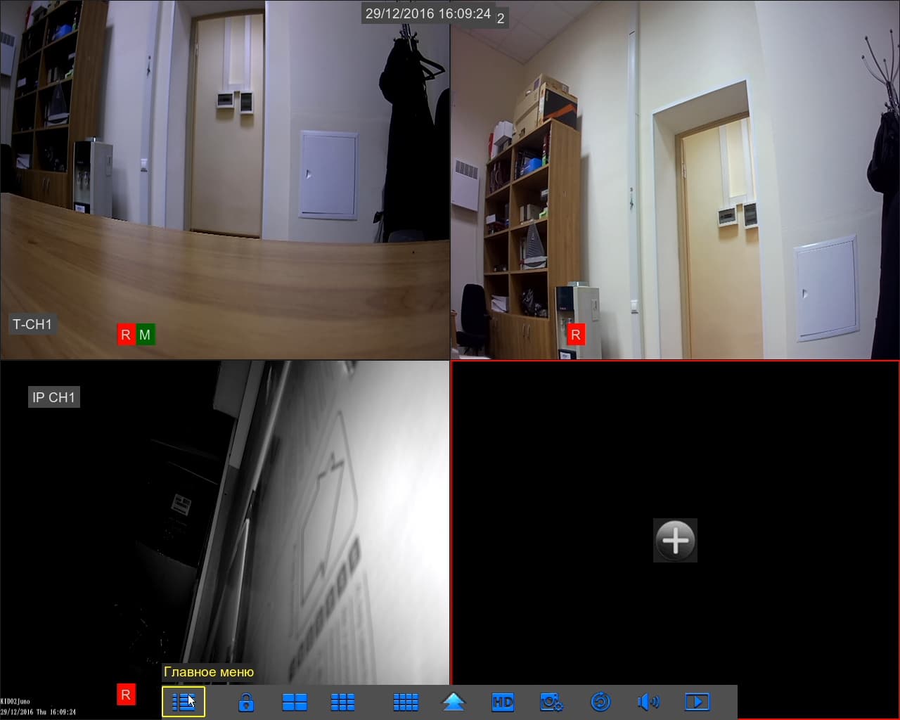 При наведении мышки на нижнюю часть окна или нажатии кнопки на пульте, показывается меню для перехода к настройкам, режиму просмотра, изменению сетки, включению последовательного переключения камер и с другими функциями.