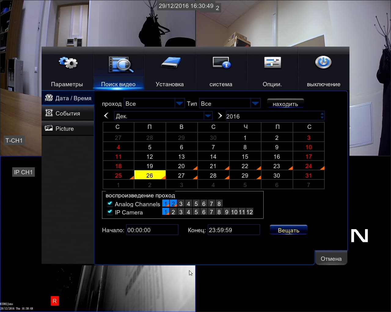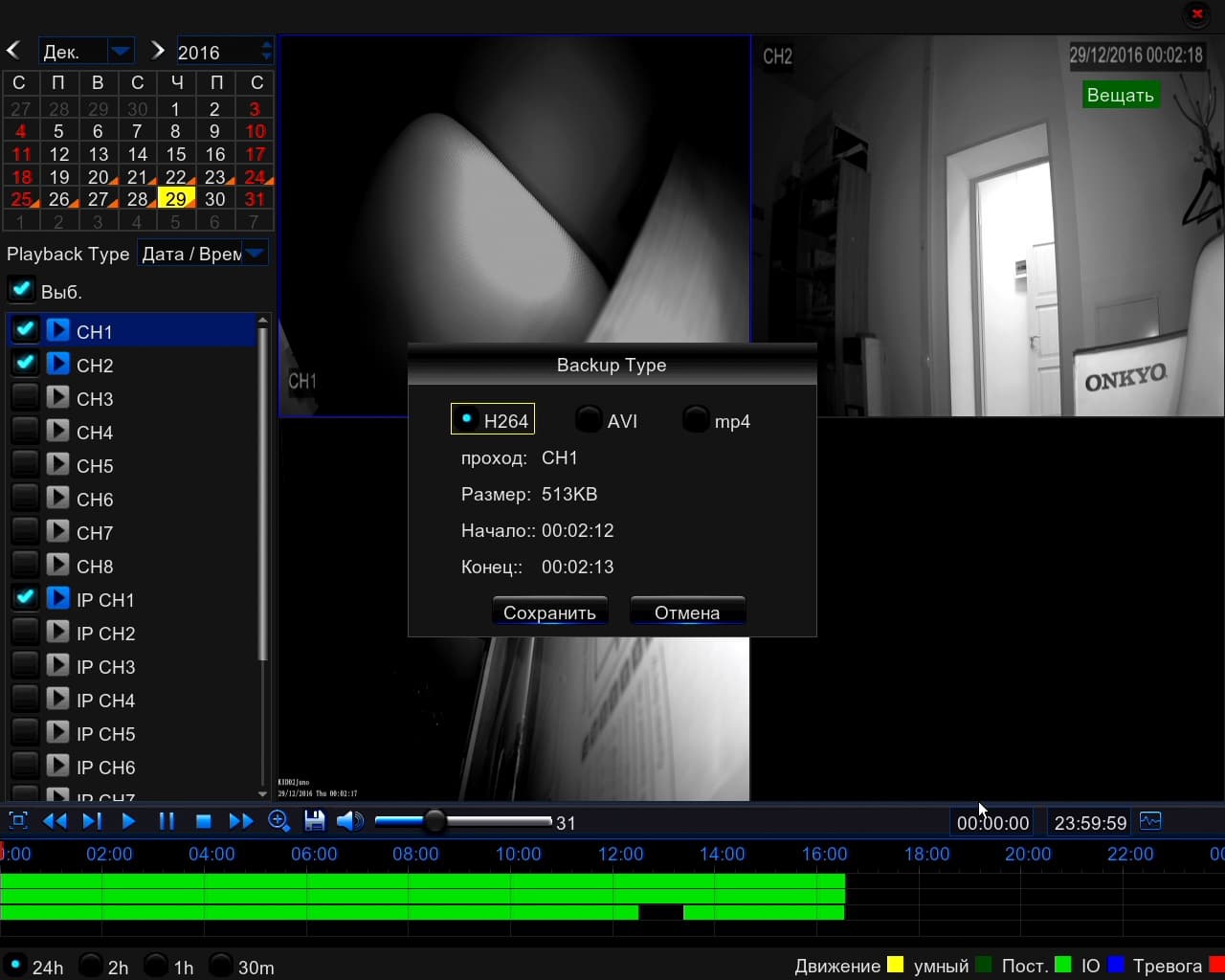 В этом же окне можно более точно указать время, выбрать нужные каналы, проверить режим записи, осуществить экспорт выбранных видео на внешний накопитель.