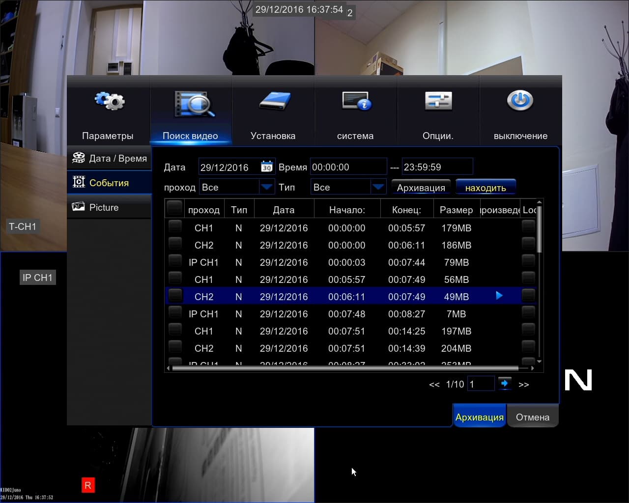 Еще один вариант поиска — по событиям с учетом даты, времени, камеры и режима. В этом окне можно перейти к просмотру найденного ролика или переписать все или некоторые видео на USB-диск. Третий вариант аналогичен второму, но работает не с видео, а с изображениями.
