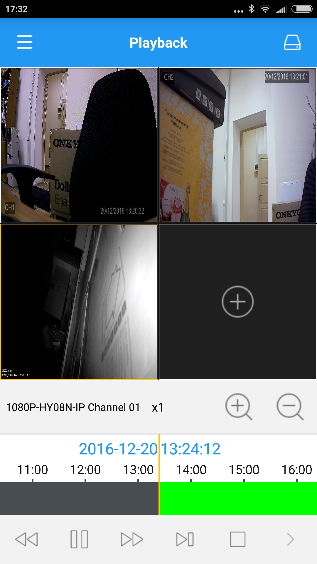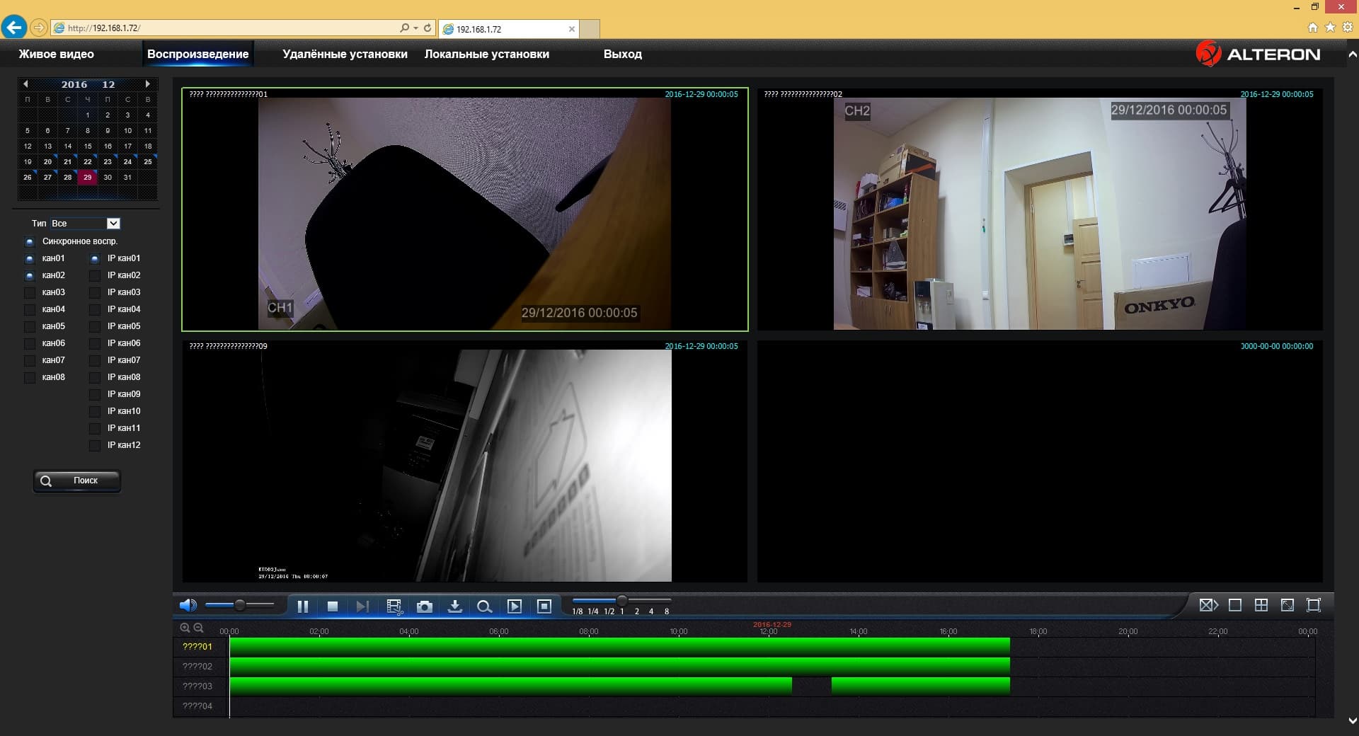 Здесь указать нужные параметры поиска, фильтры по камере и типу записи. Далее после нажатия кнопки «Вещать» вам будут показаны запрошенные видео, причем можно смотреть синхронные записи сразу с нескольких камер. Дополнительно предусмотрены режимы ускоренного и замедленного воспроизведения, а также цифровое увеличение.