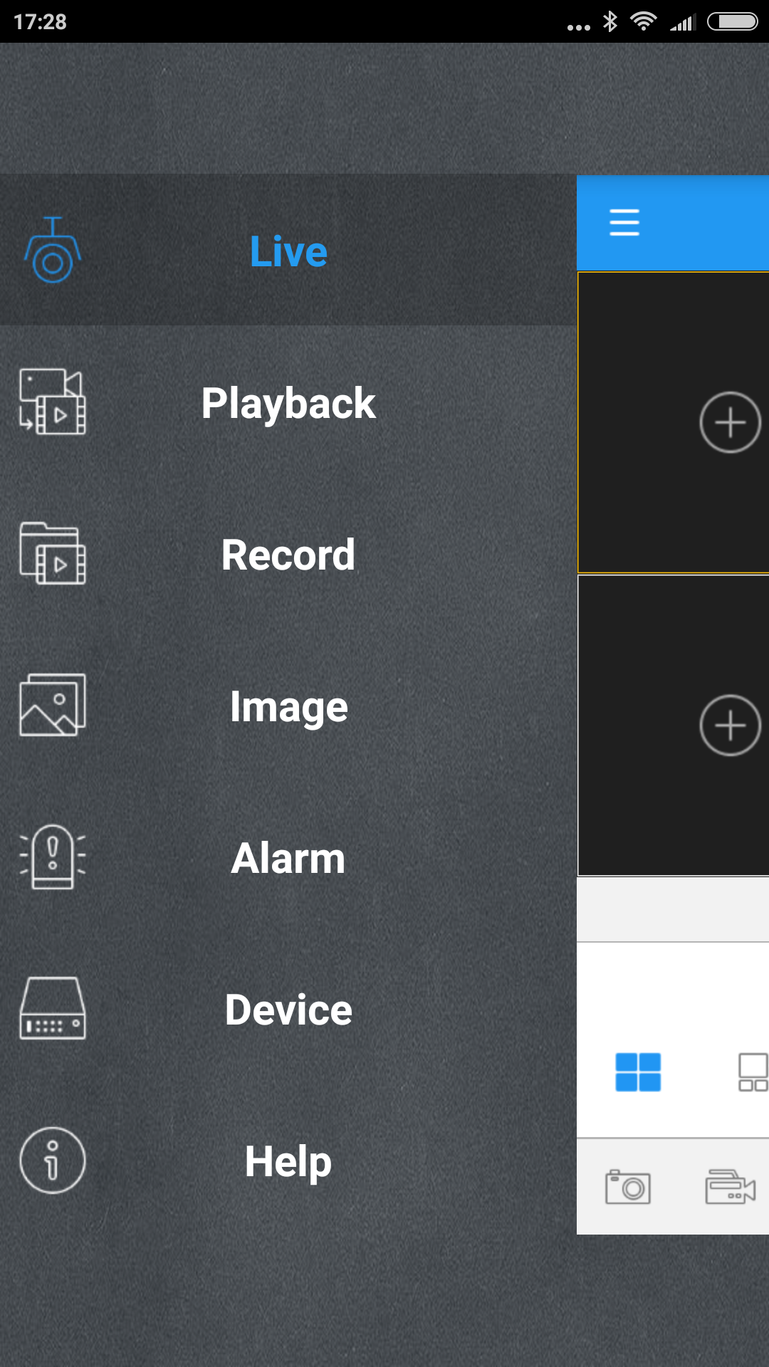 После подключения и авторизации у вас будет доступ к живой картинке, архиву записей на регистраторе, а также сохраненным на самом смартфоне изображениям и видео.
