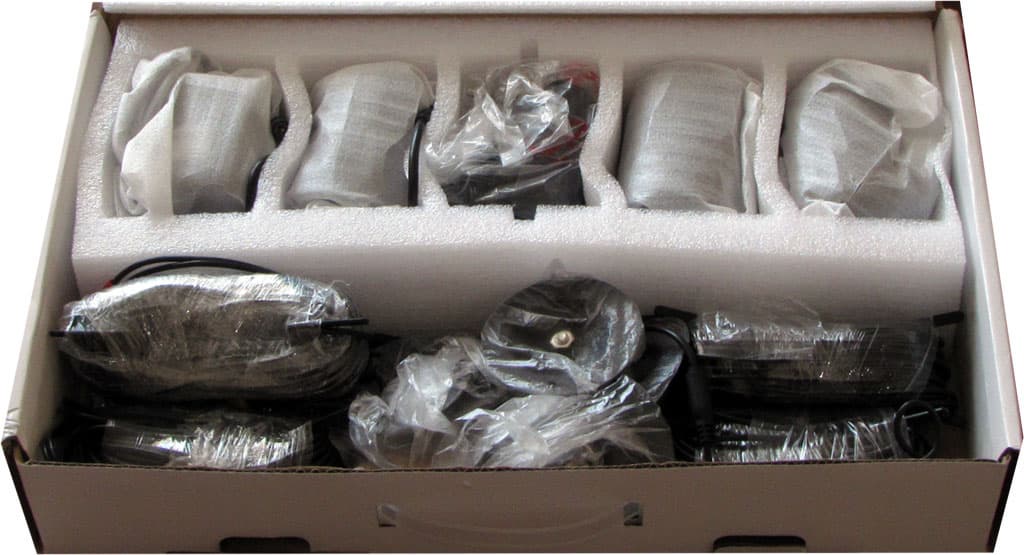 Что и говорить — богато. Четыре CCD-камеры с регулируемыми кронштейнами, импульсный блок питания для них, комплект соединительных кабелей и небольшой монтажный комплект. При этом все составляющие этого комплекта тщательно и аккуратно упакованы. А еще в наличии есть диск с ПО и подробными инструкциями (судя по названию одного из файлов, русский вариант инструкции также имеется) и два листа формата А4, на которых полиграфически красиво сообщается о процессе быстрого запуска видеорегистратора и о монтаже и подключении камер.