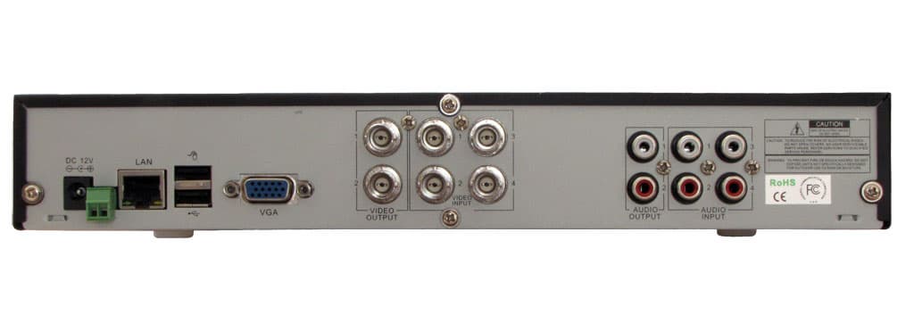 Задняя же панель имеет более классический вид — здесь подключаются четыре камеры, четыре микрофона, два аудиовыхода, два дублирующих друг друга коннектора BNC, VGA-монитор, порт RJ45 для сети 10/100 Мбит/с, два USB-порта (причем у них строгое разделение ролей — в верхний можно подключать только мышку (она также входит в комплект), а в нижний — какой-либо USB-носитель для резервных копий фрагментов архива), порт RS485 для управляемых камер и коннектор для подключения выносного блока питания. Кстати о блоке питания — то, что он сделан выносным — это большой плюс. Тепло, им выделяемое, не останется внутри корпуса видеорегистратора, и, как следствие, тепловой режим платы видеорегистратора будет не таким напряженным.
