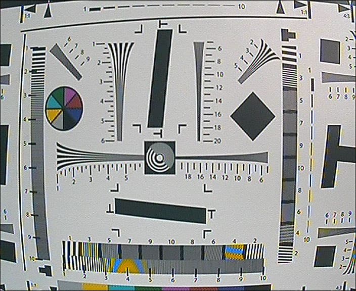 Горизонтальное разрешение камеры находится на уровне 330 ТВЛ. Вертикальное же практически дотягивает до 380 ТВЛ, что не так уж и далеко от заявленного производителем значения. Геометрические искажения в кадре, которые чертовски мешают правильному размещению в кадре тестовой таблицы, вполне объясняются широким углом обзора (иначе говоря — небольшим фокусным расстоянием). Таким образом, производитель укомплектовал видеорегистратор широкоугольными камерами, основная задача которых — подать изображение с максимально большей площади.