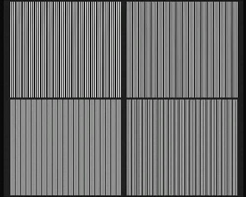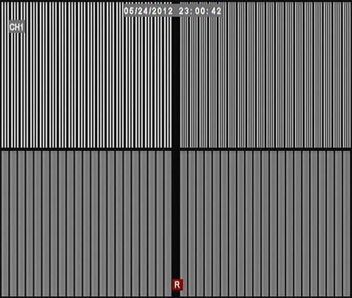 Архивная же запись от эталонной отличается сильнее — отмечаем падение вертикального разрешения в два раза. Объяснение простое — при оцифровке видеопотока до архивного состояния видеорегистратор захватывает лишь одно поле кадра из двух (что хорошо видно на тестовой таблице с динамическим элементом), а возникающие по этой причине геометрические искажения компенсируются программными алгоритмами (попросту говоря — растягивается изображение по вертикали). Такое поведение видеорегистратора — не есть что-то необычное или плохое, так поступают практически все производители видеорегистраторов этого ценового диапазона. Конечно, вертикальное разрешение при этом падает в два раза, но этот факт вполне компенсируется правильно подобранными и размещенными камерами наблюдения.
