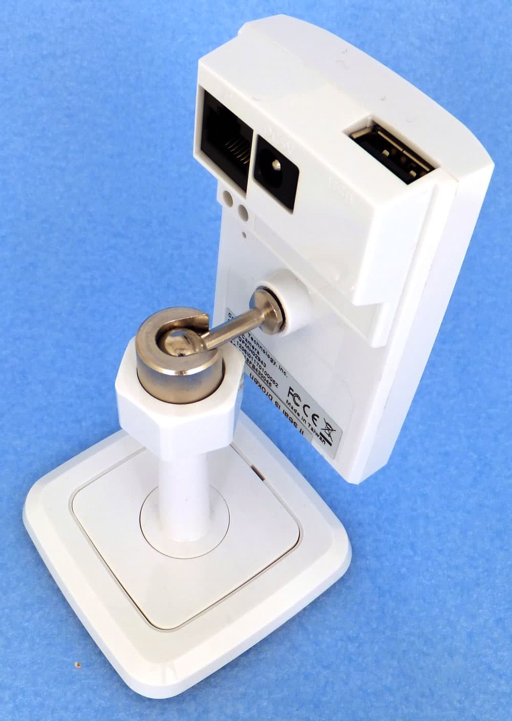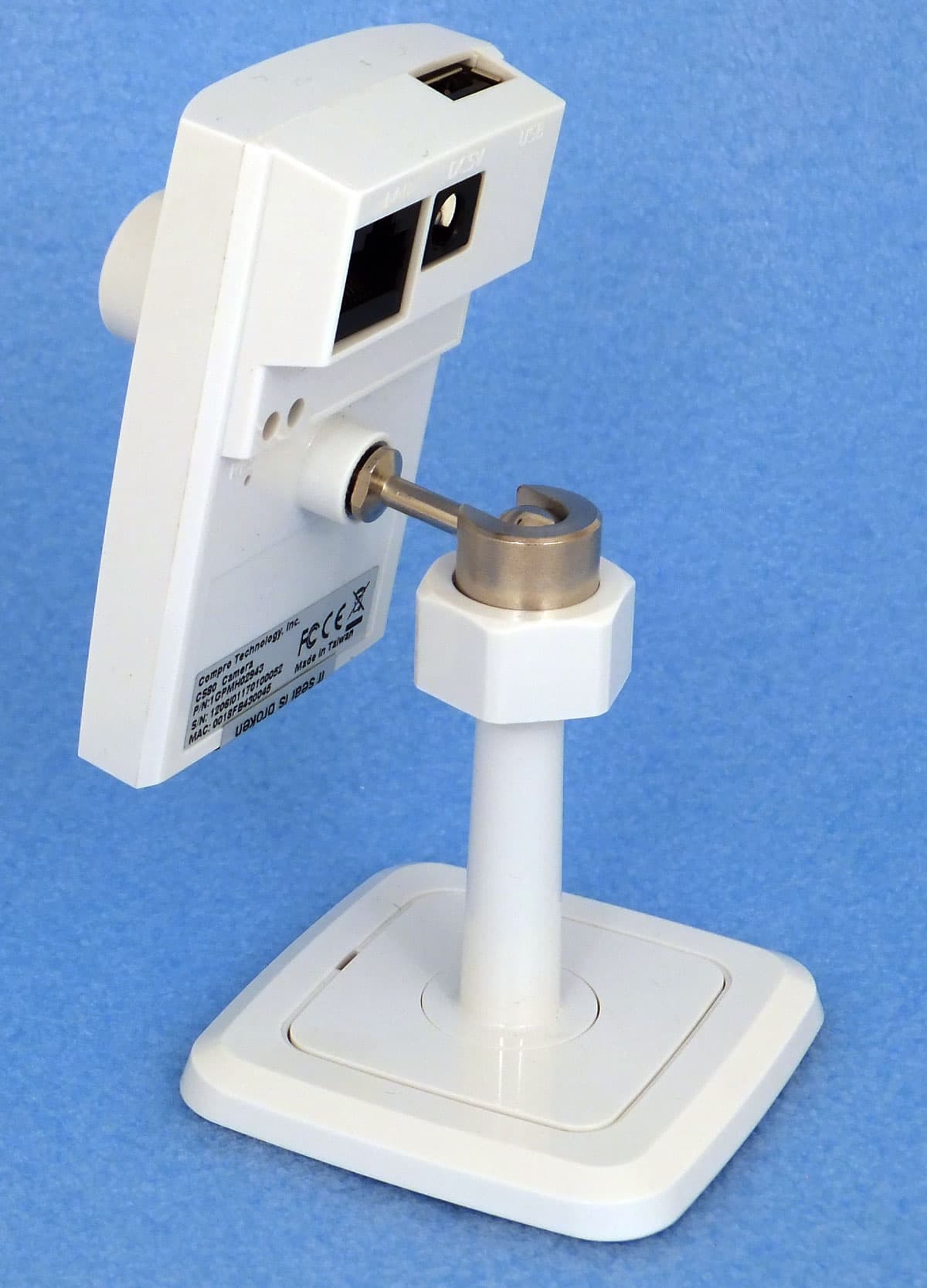 Упомянутый в списке кронштейн представляет собой простенькую подставку с квадратным основанием, в котором прорезаны отверстия под саморезы. Эта подставка имеет также длинную ножку. Верх ножки выполнен в виде сферического углубления, куда вставляется металлический шарик, к которому, в свою очередь, крепится корпус камеры. Этот шарик прижимается к сферическому основанию ножки посредством закручивания крышки-гайки с внутренней резьбой. Таким образом, прикреплённая к ножке камера имеет достаточно степеней свободы, чтобы вращать её на 360°, поворачивать и наклонять в любую сторону. Камера фиксируется в выбранном положении той самой пластмассовой гайкой. В общем и целом конструкцию нельзя назвать подходящей для промышленного применения — налицо все признаки устройства, предназначенного для использования в быту или в небольших офисах. Это подтверждается использованием пластмассовых креплений, да и миниатюрный размер устройства говорит о том же.