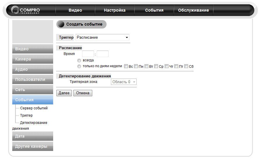 Камера может отправить снимок не только в случае срабатывания детектора движения, но и выполнять регулярную отправку в заданные периоды времени. Настройка этих действий производится здесь же, в разделе «События», а параметр называется «Триггер». Этих триггеров можно создать сколько угодно, камера послушно выполнит все взваленные на неё обязанности.