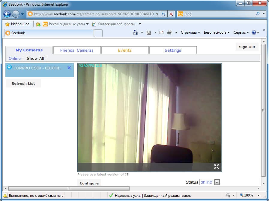 При этом вовсе не обязательно иметь установленным на ПК данное приложение. Зайти в Seedonk можно и через обычный браузер: залогинившись на сайте, пользователь обнаружит список своих активных камер и, щёлкнув по любой, увидит живую картинку.