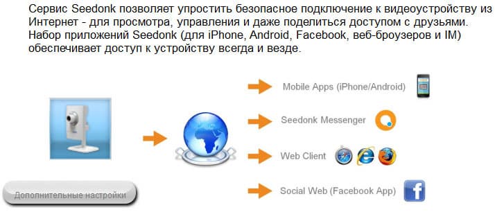 Мобильным пользователям рекомендуется настроить камеру на этот Seedonk, поскольку он позволяет получить возможность просмотра и управления камерой с помощью приложений для iPhone, Android и т. п.