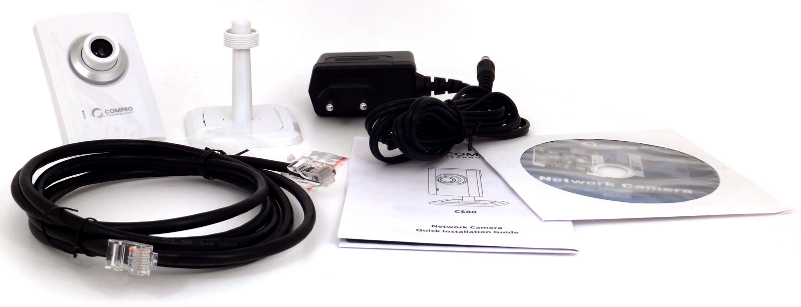 Комплектность камеры вполне стандартна: камера, кронштейн с прилагаемыми к нему двумя саморезами и дюбелями, полутораметровый сетевой кабель, адаптер питания, краткая инструкция и диск с ПО.
