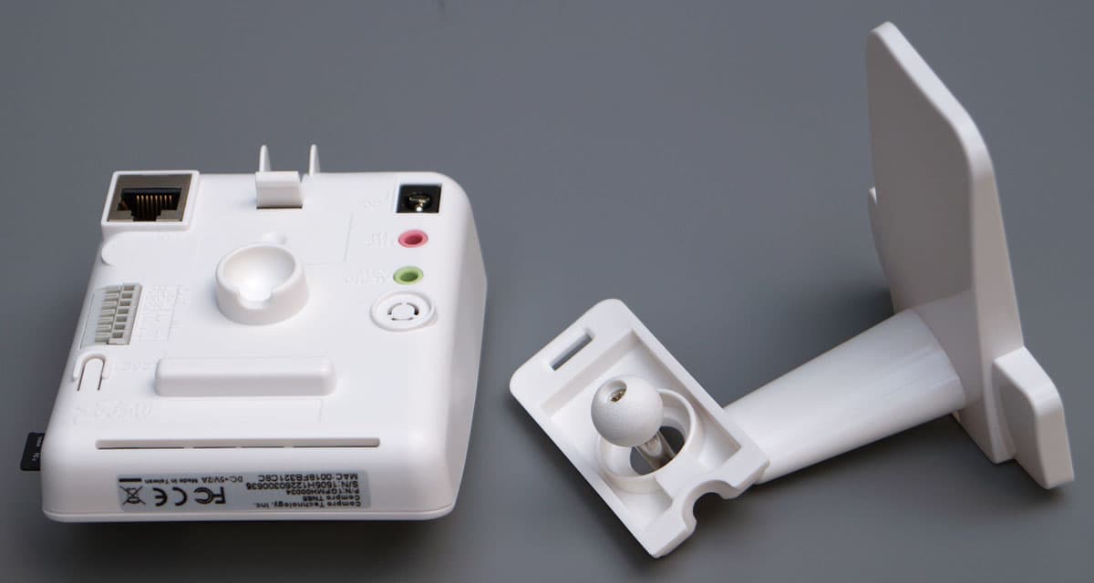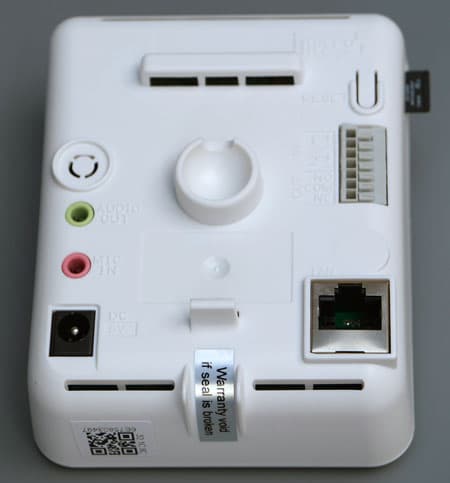 Служебные интерфейсы находятся с обратной стороны корпуса. Здесь расположены аудиовыход, микрофонный вход, разъем адаптера питания, кнопка Reset для возврата к заводским настройкам, разъем колодки сигнальных входов/выходов и сетевой разъем LAN. Слот для карты памяти формата micro SD встроен в боковую стенку корпуса.