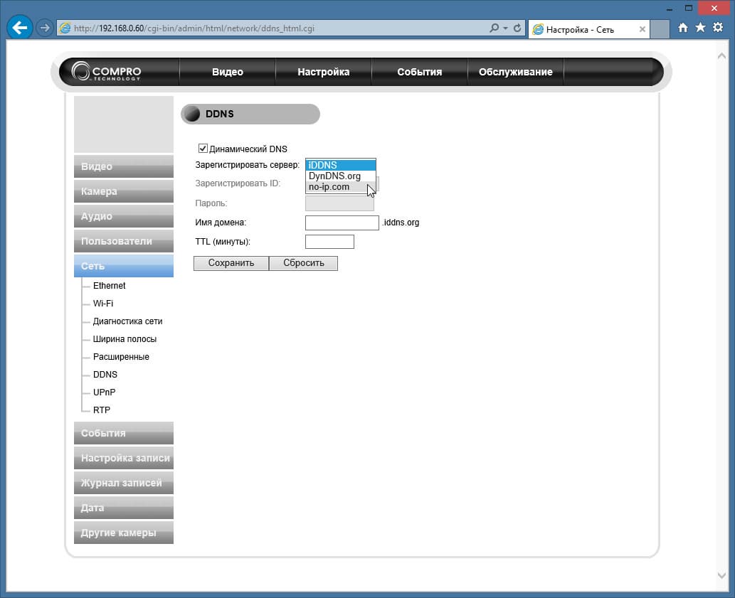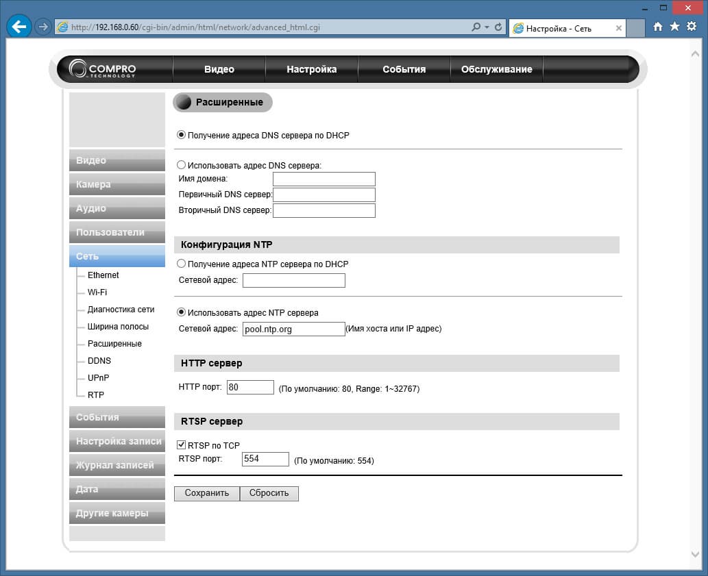 | Параметры видеокадра: яркость, резкость, насыщенность, баланс белого, изменение кратности выдержки в целях устранения мерцания источников света, экспозиция, уровень усиления, добавление текста или логотипа, переворот картинки | Сетевые настройки состоят из параметров подключения Ethernet, диагностики текущего соединения, выбора сервиса, который предоставляет динамический DNS (поддерживаются DynDNS.org и no-ip.com) | Расширенные сетевые настройки позволяют изменить способ получения адреса DNS, изменить номера используемых портов для HTTP и RTSP | В пункте Серверы событий имеется возможность добавить и изменить параметры таких серверов, как почтовый, SMTP. FTP и других ресурсов |
