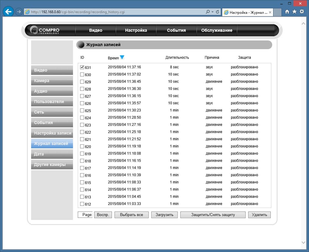 Эти настройки традиционно разбиты на множество подразделов, в которых изменяются параметры видеокадра, сетевого подключения, создаются серверы для будущей отправки оповещений о событиях или записи этих событий, настаиваются детекторы движения и звука, а также ведется анализ журнала событий с возможностью скачивания записанных на карту памяти роликов.