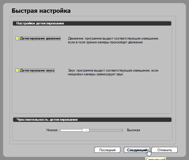 | Поиск камеры в локальной сети | Настройка видеопотока | Активация детектора движения и звука | Выбор папки на диске для записи и хранения видеоархива |