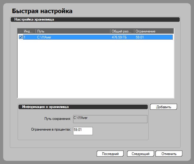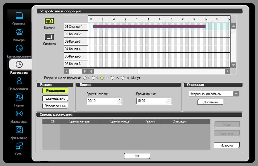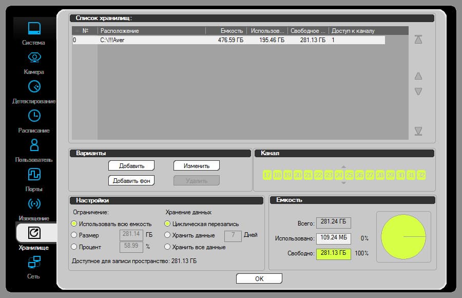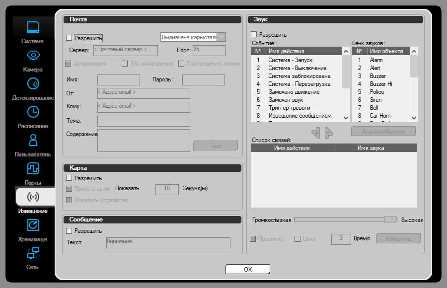 | изменение расписания записи для каждой камеры. Если наблюдение определенной камерой в какое-то время суток не требуется, его можно деактивировать | Настройка извещений о событиях: e-mail, всплывающее сообщение, заданный звук | Настройка архивной папки. Здесь можно добавлять папки и диски, изменять их емкость, а также способ записи |