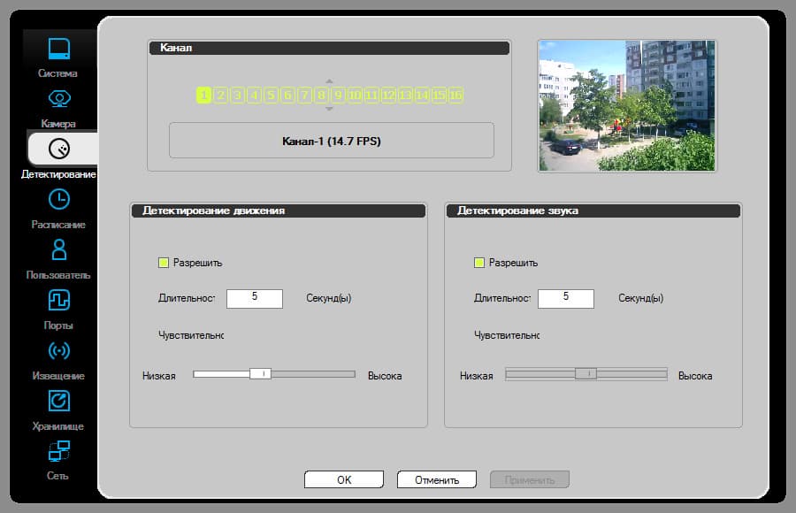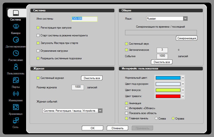 | Общие настройки, включающие также частичное изменение цветовой гаммы интерфейса | Настройка подключенных камер: реакция на события, порядок и способ подачи уведомлений | Настройка детекторов видео и звука. В отличие от настроек, предоставляемых веб-интерфейсом самой камеры, здесь отсутствует возможность задать зоны (области) для анализа |