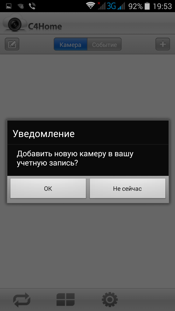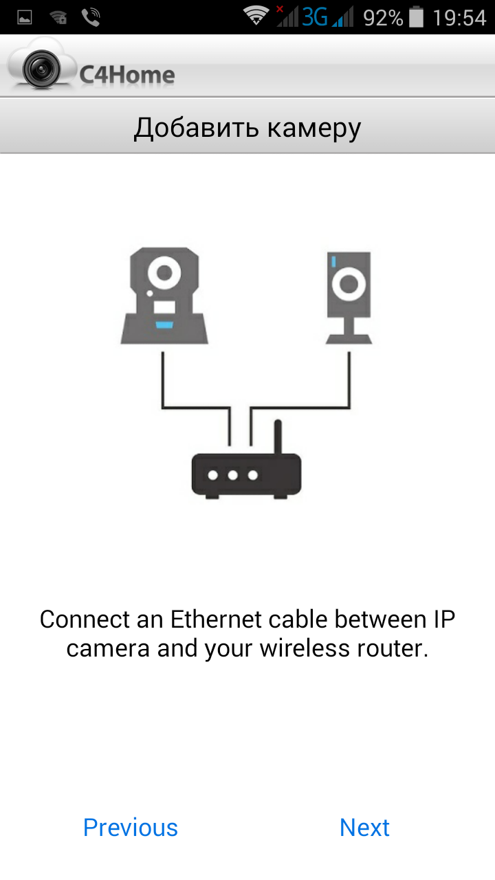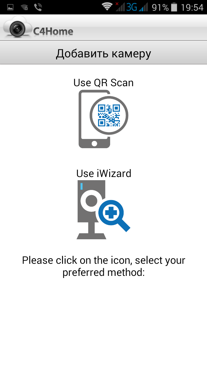 Для осуществления первого способа понадобится смартфон или планшет с установленным приложением C4Home и зарегистрированной учетной записью в этом облачном сервисе. Камере, которую мы собираемся добавить, следует подать питание и подключить кабелем к локальной сети. Другого способа подключения, к сожалению, не имеется — в рассматриваемом аппарате отсутствует адаптер беспроводной сети, также здесь нет и USB входа для подключения такого адаптера. Теперь остается лишь следовать шагам, отображаемым на дисплее смартфона: подключение камеры и фотографирование QR-кода, который наклеен в нижней части корпуса аппарата.