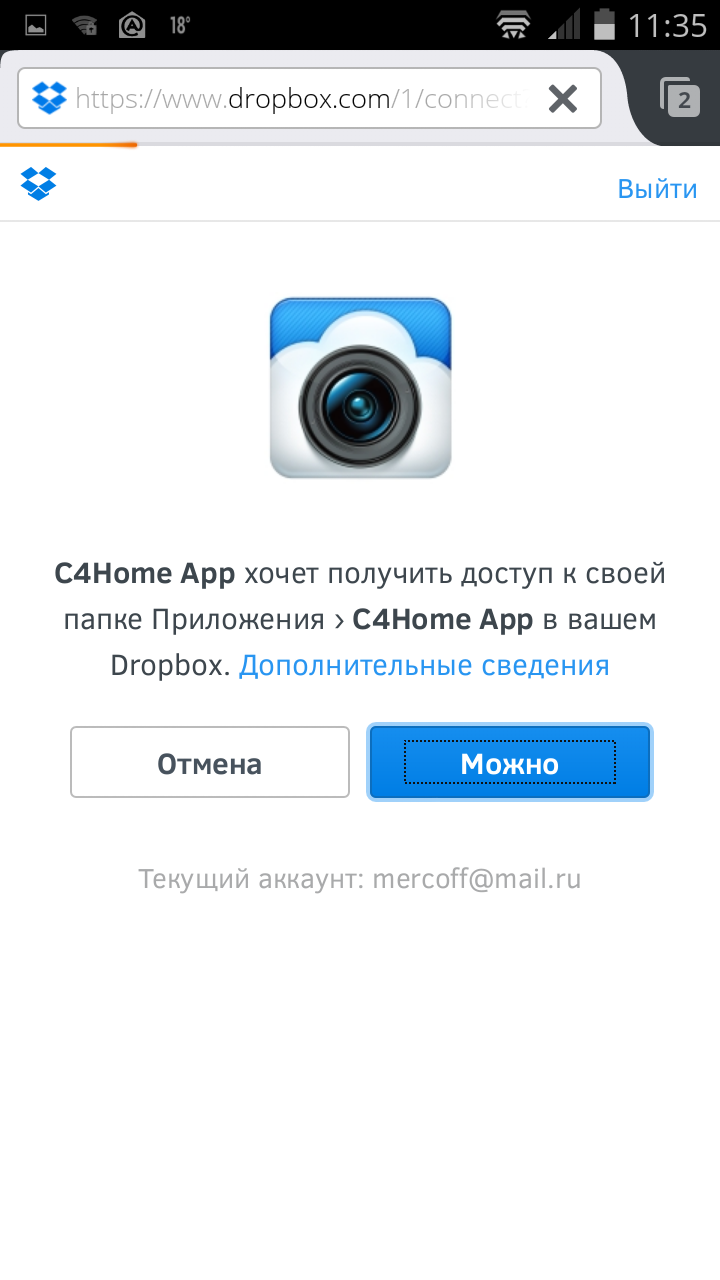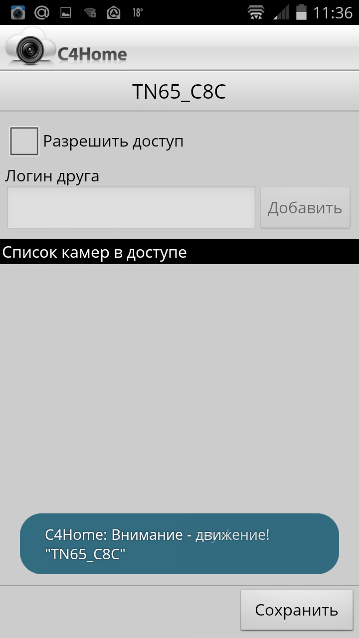 | Настройка детектора движения и звука | Включение записи событий с отправкой стоп-кадров в хранилище DropBox | Запрос разрешения на доступ камеры к DropBox | Добавление пользователя к просмотру камеры (другой учетной записи C4Home) |