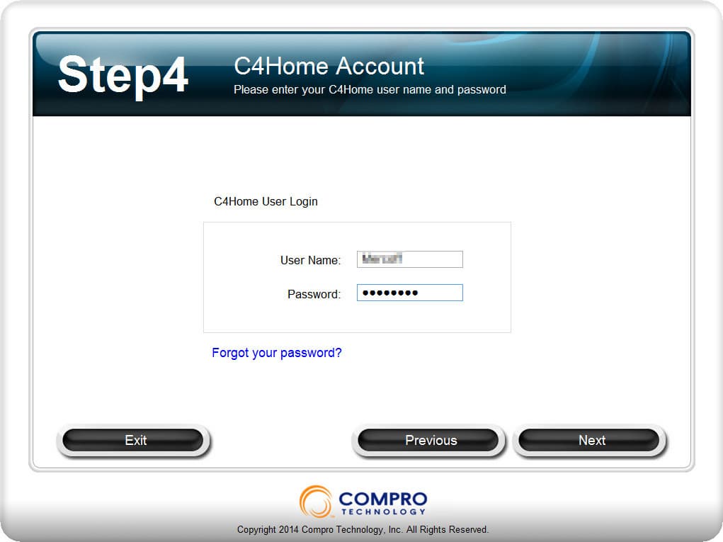 | Создание новой учетной записи C4Home | Вход в существующую учетную запись C4Home | Завершение настройки с кратким отчетом |