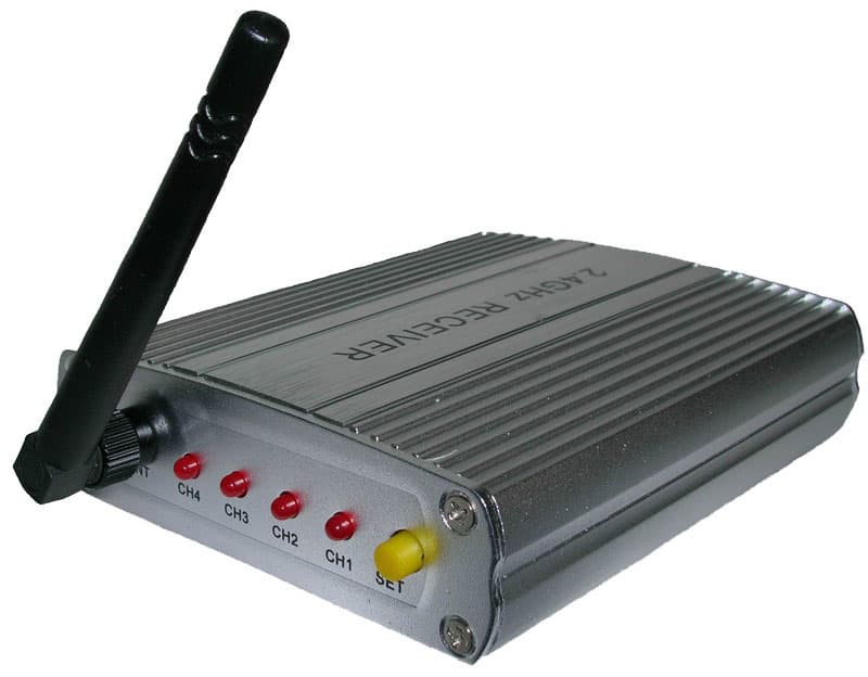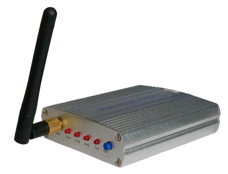 На передней части блока приемника размещены четыре светодиода, обозначающие, на какой именно канал настроен приемник видеосигнала. Переключение каналов на приемнике происходит с помощью небольшой кнопки "Set". А сама видеокамера настраивается на определенный канал изготовителем, о чем свидетельствует круглая наклейка на корпусе видеокамеры с номером канала. Одновременно возможна работа не более чем четырех видеокамер, так как диапазоны частот у двух видеокамер одного канала одинаковы. Рядом расположено гнездо для подключения антенны. Возможно подключение к приемнику и других, более чувствительных, антенн.