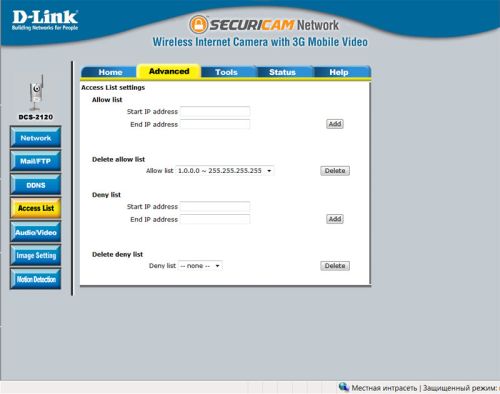 Четвертая кнопка, «Access List», позволит определить диапазоны IP-адресов, с которых можно подключаться к камере. Либо же наоборот, указать диапазоны, с которых нельзя производить такие подключения: