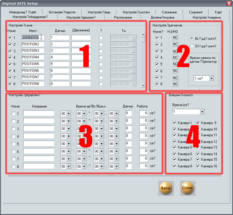 Первое поле — Настройка камер (1) — включает в себя список доступных видеокамер. Единственная, пожалуй, практическая польза этого поля — возможность задать имя каждой из камер, при этом заданные имена станут отображаться в главном окне программы во время работы. Таким образом, вы никогда не запутаетесь, и вам не придется запоминать, где какая камера находится. Имена камер вносятся в графу Мест (поскольку русский язык по-прежнему отображается в программе некорректно, в настоящей статье мы будем называть имена параметров тем же птичьим языком, что наблюдаем на скриншотах), где по умолчанию имена заданы словом POSITION1, 2, 3 и т.д.