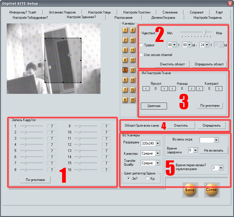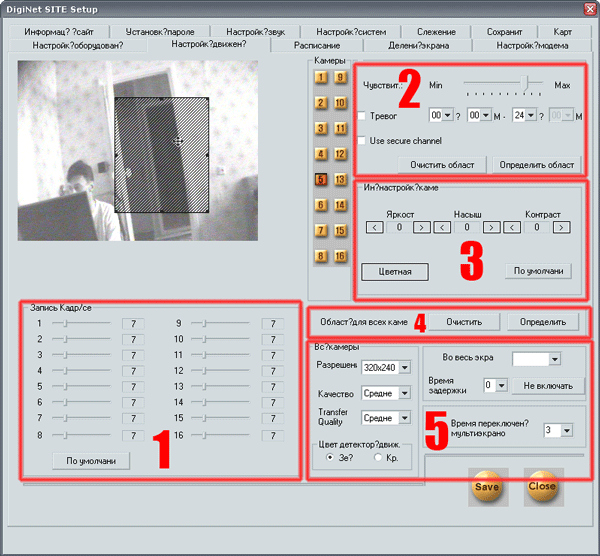 В следующем поле (4) вы можете сбросить заданные ранее области детекции движения сразу для всех камер, и определить единственную, также для всех камер одновременно. Но это, как кажется, довольно редкий случай, и вряд ли может когда-то понадобиться. Последнее поле (5) определяет разрешение и качество отображаемого и записываемого видео. Здесь вряд ли поможет какой-то совет или рекомендация. Все — исключительно на собственный вкус и по своим возможностям. Задав высокое разрешение, вы наверняка столкнетесь с падением уровня fps (кадров в секунду), зато увеличите шансы впоследствии распознать личность нарушителя.