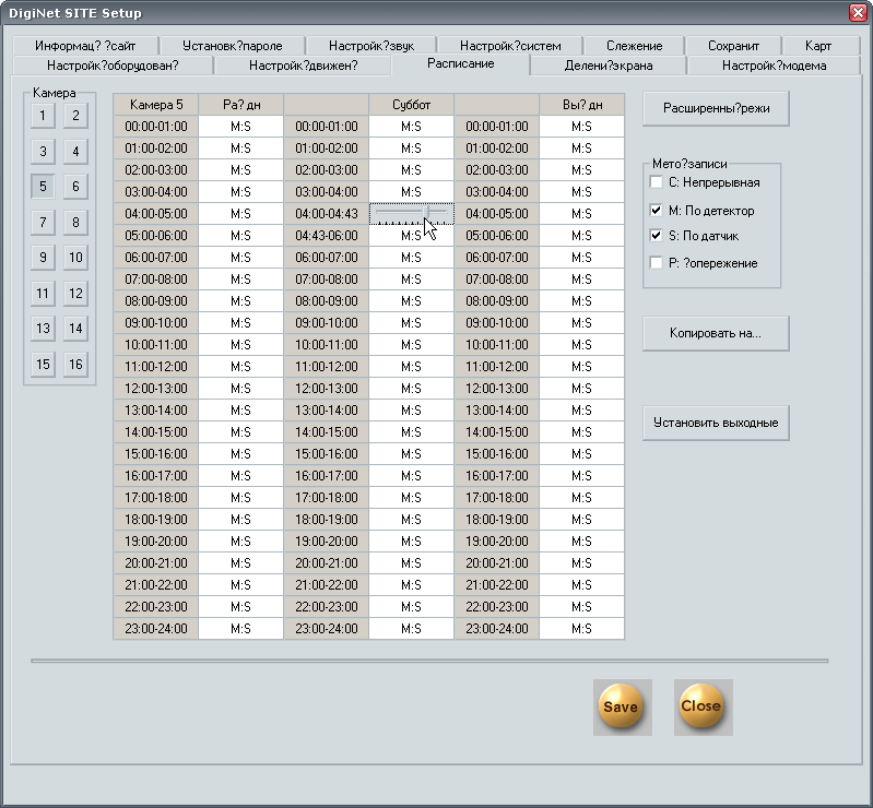 Следующая вкладка настроек, Расписание, позволяет задать время работы сразу всех камер и даже предоставить некоторым из них выходные дни.