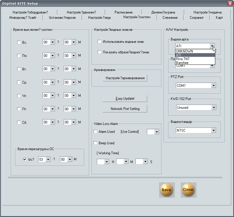 Имеющая мало о чем говорящее название вкладка Настройка системы включает в себя множество параметров; из наиболее важных следует отметить такие, как время выключения системы (имеется в виду и комплекс, и компьютер, на котором он установлен). Также не будет вредным заглянуть в поле H/W Настройки - здесь существует возможность выбрать из выпадающего списка ту видеокарту, которая установлена на данном компьютере. Как видно из рисунка, программа не предлагает никаких современных продуктов от NVIDIA, зацикливаясь на любых ATI либо устаревших NVIDIA-картах. В первой части обзора говорилось о возможных проблемах в случае применения современных видеоадаптеров NVIDIA. Справа внизу находится неприметное поле Видеостандарт, здесь по умолчанию выставлен NTSC — при необходимости можно выбрать и PAL.
