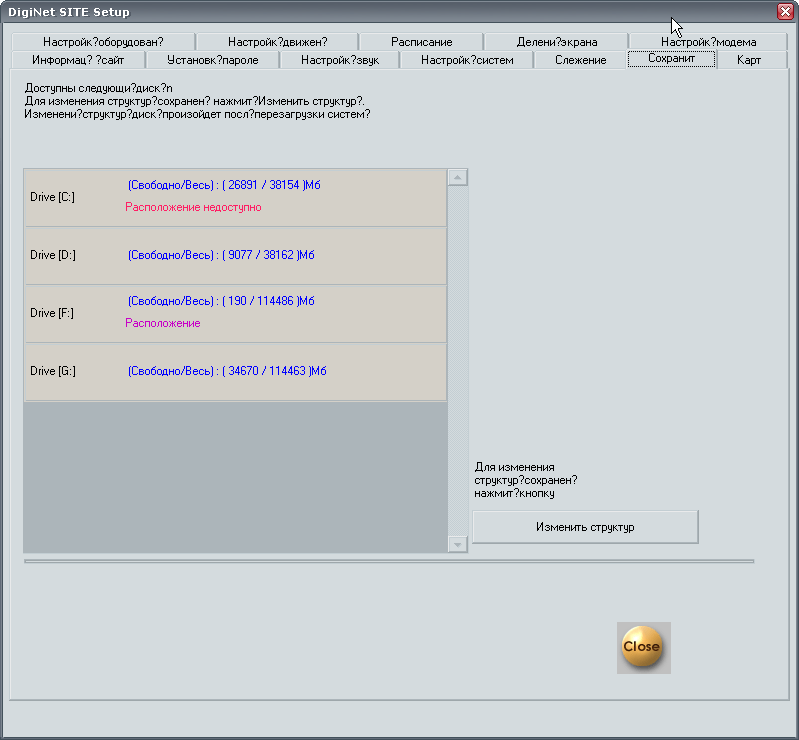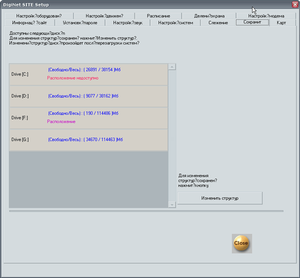 Предпоследняя вкладка Сохранит (надо думать, имеется в виду Сохранение) позволяет в любой момент времени изменить место хранения видеоархива. Например, если вы подключите новый жесткий диск либо диск с материалом, записанным ранее, для просмотра произошедших событий, то вам придется изменить настройки на данной вкладке.