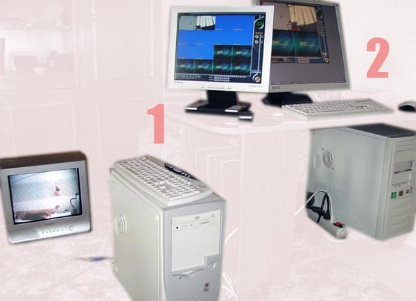 На фотографии видно, что сигнал, поступающий с видеокамер на первый компьютер (1), обрабатывается платой, и одновременно выводится на телевизор. Второй компьютер (2), подключенный к основному, позволяет вести просмотр происходящего в реальном времени и даже управлять большинством параметров "родителя", вплоть до перезагрузки ПК.