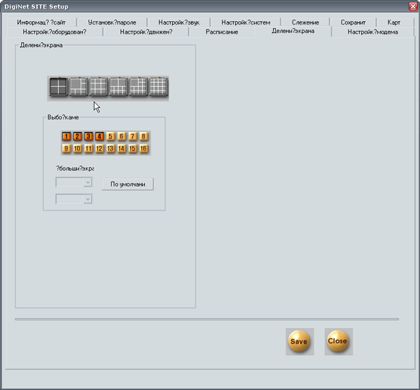 Вкладка Деление экрана изменяет способ отображения камер по умолчанию во время запуска DigiNet Site. Все эти операции можно проделать, и, не входя в настройки программы, однако после перезапуска комплекса все отобразится так, как указано в данных настройках.