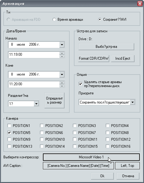 Помимо выбора интервала времени, здесь также необходимо выбрать и кодек, с помощью которого будет создан видеофайл. Особое внимание следует обратить на номера камер, отмеченные флажком, — именно с данных камер и станет записываться видео.