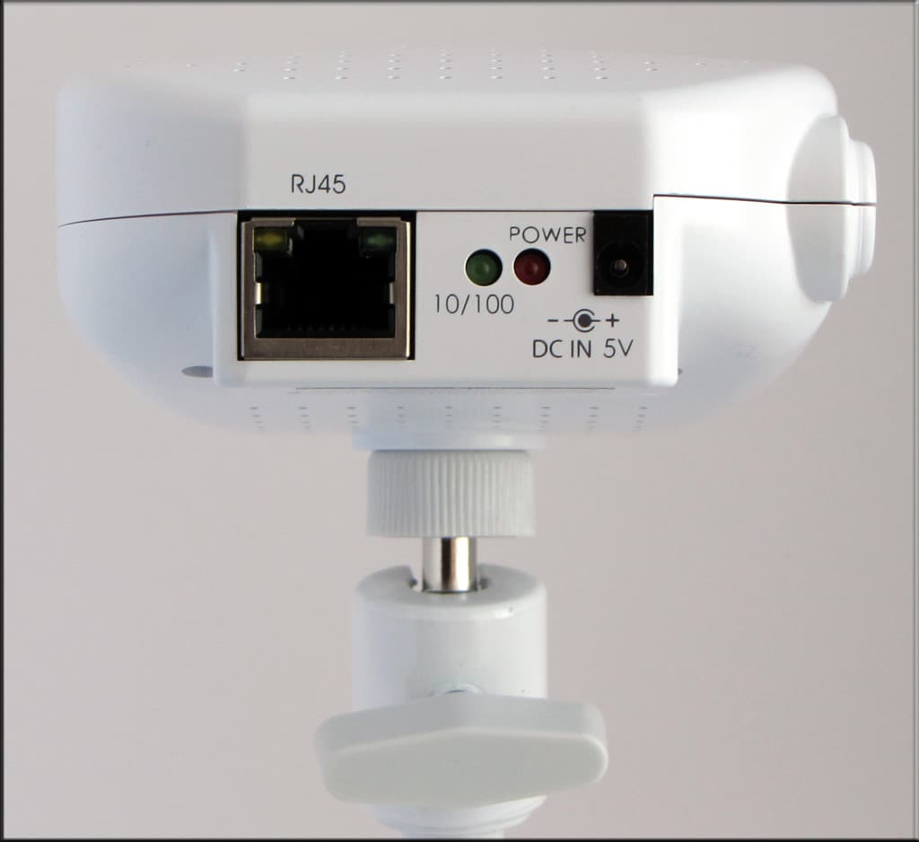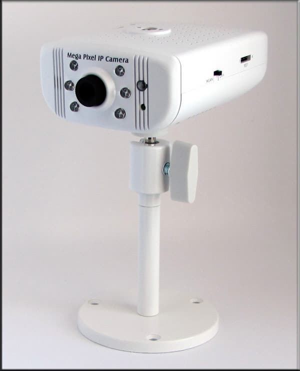 Белый пластмассовый корпус собран очень качественно, никаких люфтов или скрипов при сжатии — растяжении мы не обнаружили. На передней панели видно шесть светодиодов ИК-подсветки, чуть правее объектива — датчик фотоэлемента (он-то и определяет, когда необходимо задействовать эту ИК-подсветку). На правой стороне расположены переключатель сетевого интерфейса (существуют модели с поддержкой WiFi-сетей) и тестовый разъем. На верхней стороне камеры — две утопленных в корпус кнопки — это сброс и возврат к заводским установкам (возвращает абсолютно все — и ip-адрес, и пароль, проверено). Развернув Grand IP Mеgapixel Camera тыльной стороной, увидим следующее: